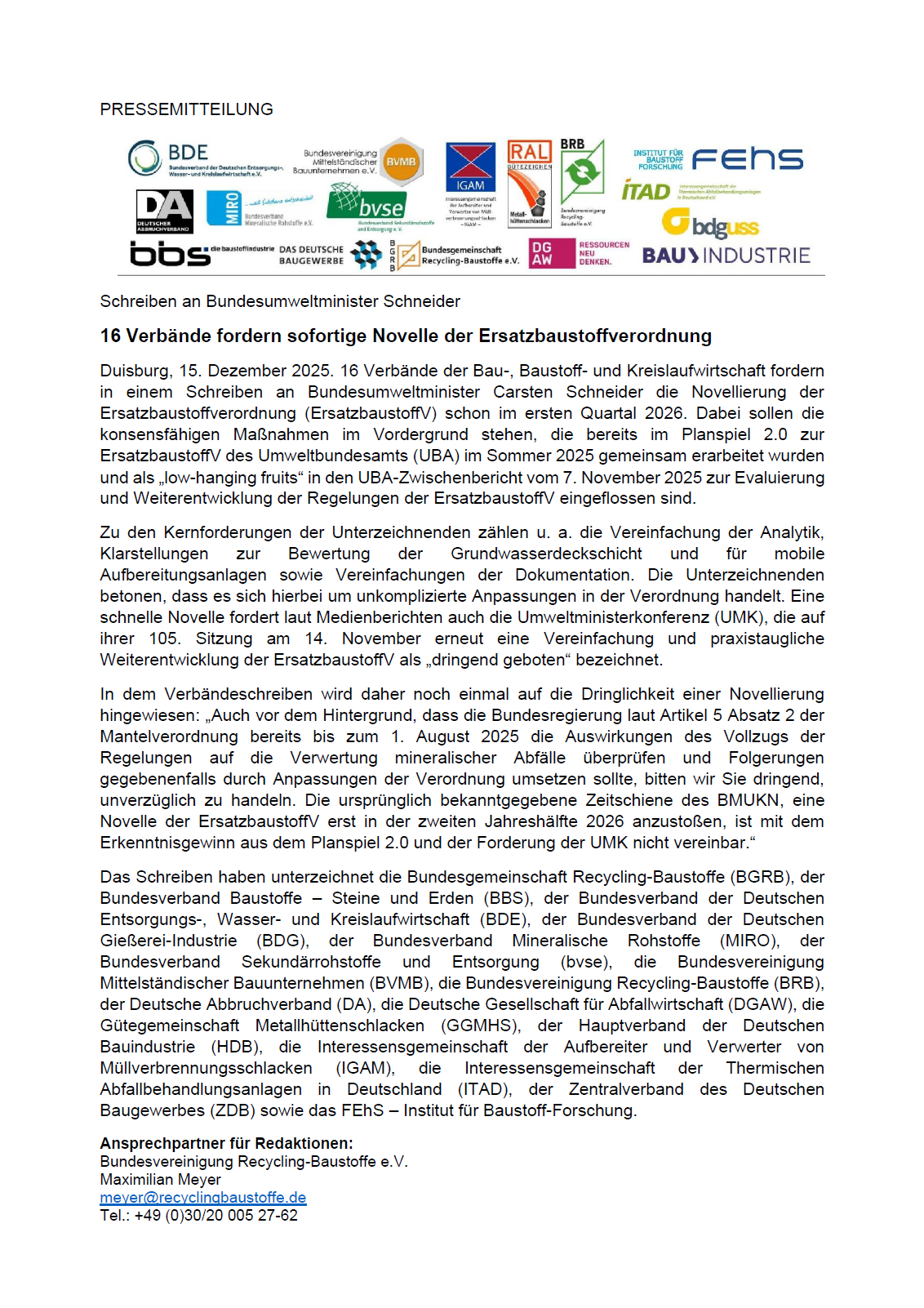 Duisburg, 15. Dezember 2025. 16 Verbände der Bau-, Baustoff- und Kreislaufwirtschaft fordern in einem Schreiben an Bundesumweltminister Carsten Schneider die Novellierung der Ersatzbaustoffverordnung (ErsatzbaustoffV) schon im ersten Quartal 2026. Dabei sollen die konsensfähigen Maßnahmen im Vordergrund stehen, die bereits im Planspiel 2.0 zur ErsatzbaustoffV des Umweltbundesamts (UBA) im Sommer 2025 gemeinsam erarbeitet wurden und als „low-hanging fruits“ in den UBA-Zwischenbericht vom 7. November 2025 zur Evaluierung und Weiterentwicklung der Regelungen der ErsatzbaustoffV eingeflossen sind.